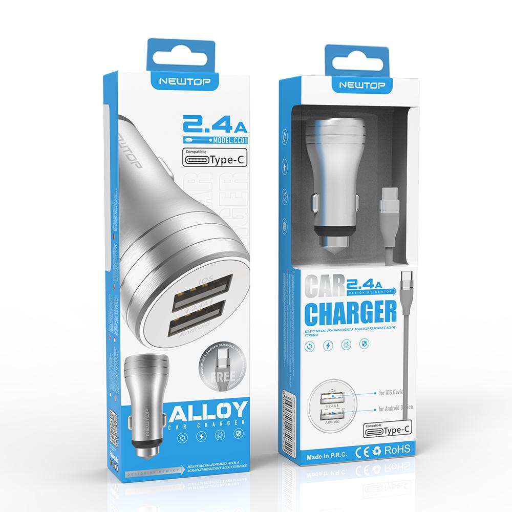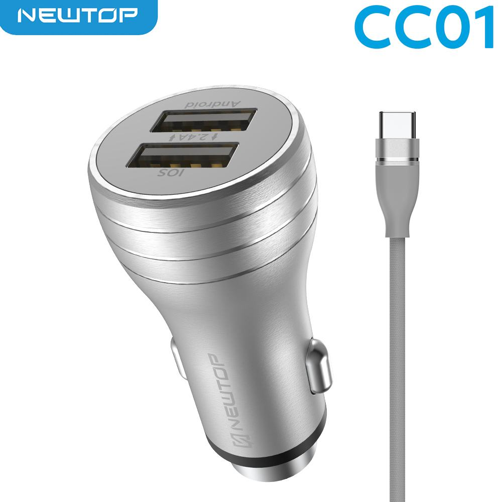 NEWTOP CC01 ALUMINIUM CAR CHARGER 2.4A 2USB CON CAVO TYPE-C
