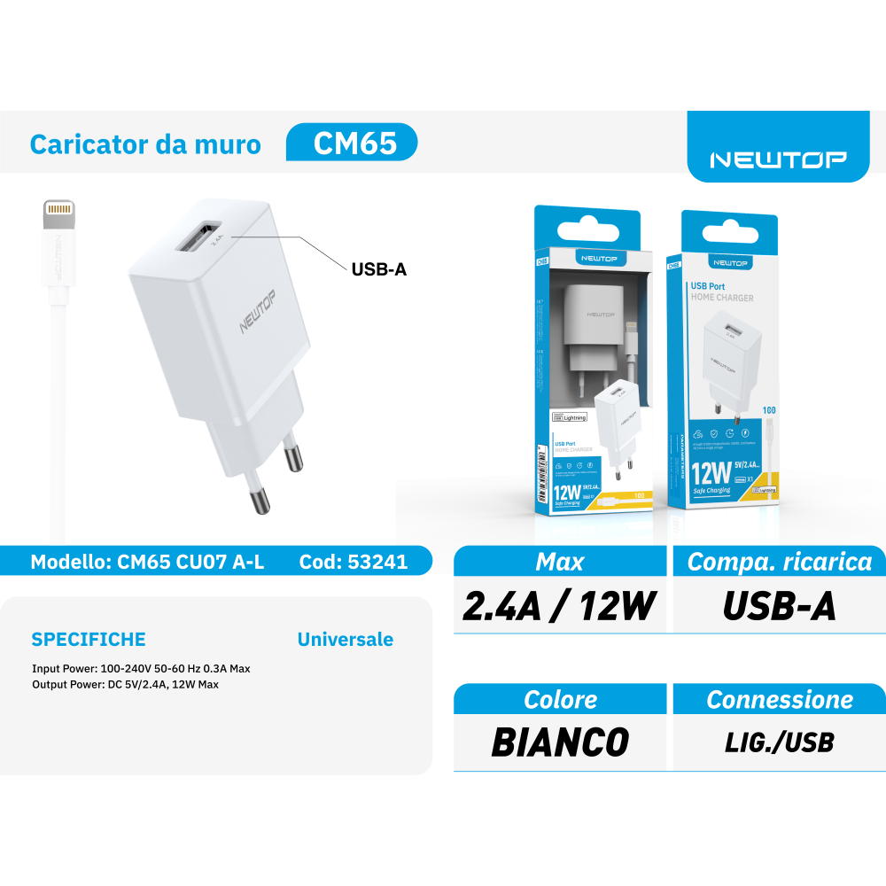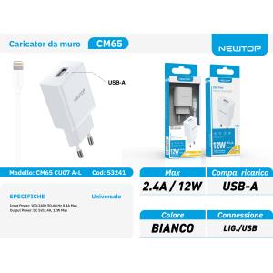NEWTOP CM65 CARICATORE DA MURO 1USB 5V 2.4A CON CAVO LIGHTNING