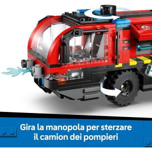 AZIONE ANTINCENDIO: i bambini possono girare una manopola per sterzare il camion giocattolo, posizionare le 4 minifigure dei pompieri LEGO® nella cabina dettagliata e lanciare elementi acqua dall’estintore