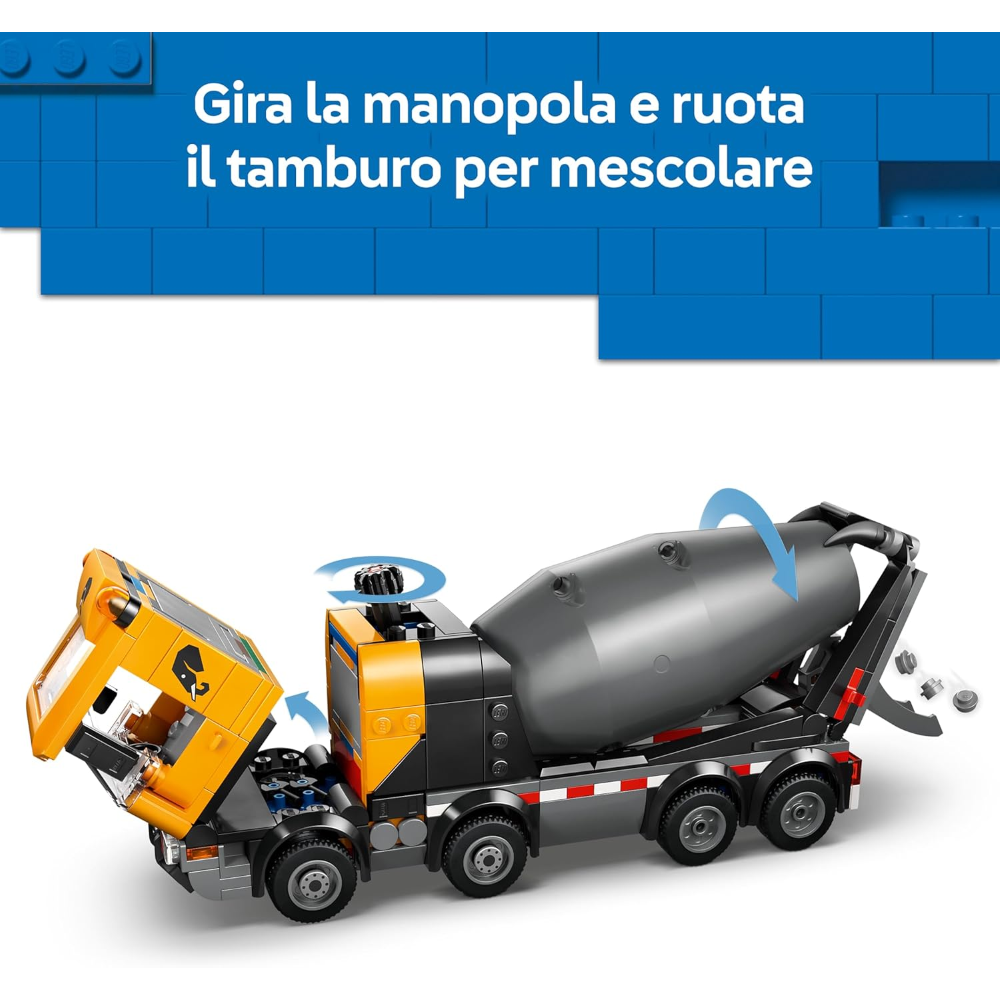 BETONIERA CON FUNZIONI AUTENTICHE: i bambini possono abbassare la condotta di scarico, girare la manopola per ruotare il tamburo e miscelare e versare gli elementi di cemento LEGO® e inclinare la cabina per accedere al motore