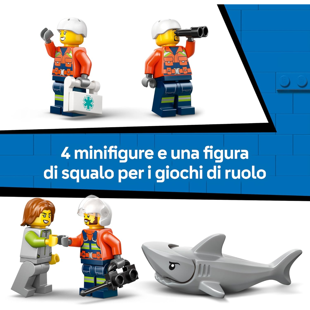 COSA C’È NELLA SCATOLA: include tutto ciò di cui i bambini hanno bisogno per costruire un elicottero di salvataggio marino dettagliato, una capsula di salvataggio, oltre alle minifigure del pilota, cittadino e di 2 guardie costiere e uno squalo