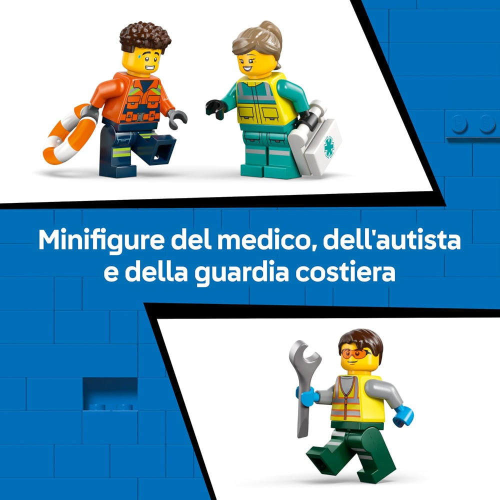 INCLUDE 3 VEICOLI ICONICI: questo kit di costruzione include un aereo medico LEGO® City, un hovercraft della guardia costiera e un camion di servizio, oltre alle minifigure di un medico, della guardia costiera e del soccorritore alpino