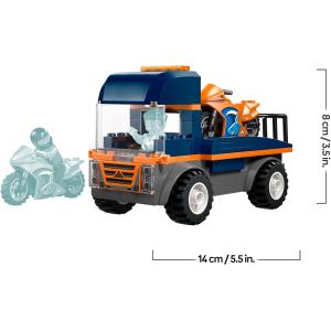 Giocattoli per il gioco di ruolo: i bambini possono posizionare una minifigure nella cabina del camion a pianale giocattolo e montare la rampa per caricare e scaricare le 2 moto modello