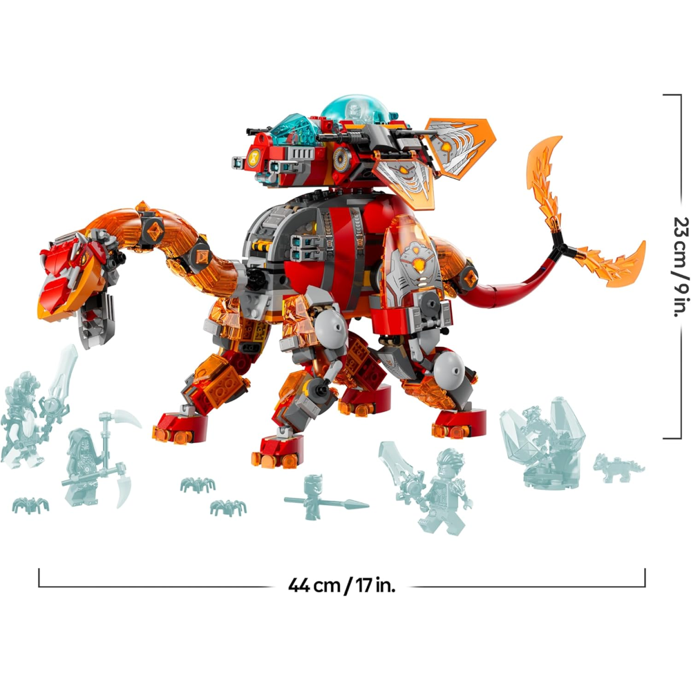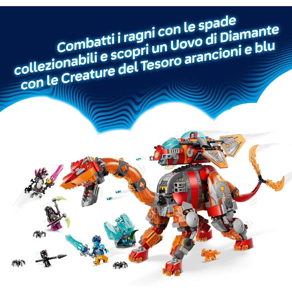 Il brontosauro è un imponente dinosauro forgiato da roccia fusa, dotato di un’enorme coda gemellare (pronta a spazzare via qualsiasi cosa sul suo cammino) e di un’astronave staccabile, mentre lo stegosauro è una bestia da battaglia con armatura rinforzata, una coda frustante e un’astronave separata. Il kit da costruzione con dinosauri include anche 4 minifigure che incoraggiano il gioco di finzione e sono dotati di spada collezionabili per combattere 3 ragni, oltre a un uovo di diamante e creature del tesoro arancioni e blu.