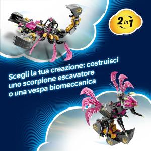 1 SET, 2 OPZIONI DI COSTRUZIONE: i bambini possono scegliere di costruire uno scorpione escavatore con pinze artiglianti ed escavatore distruttore o una vespa biomeccanica con ali snodabili e un velenoso pungiglione