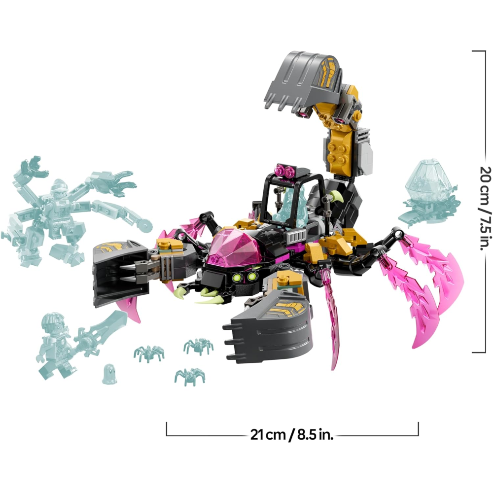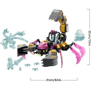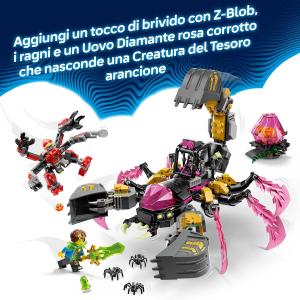 Lo scorpione fantasy giocattolo è un vero terrore a 6 zampe, dotato di pinze artiglianti, shooter e uno escavatore distruttore, mentre la vespa biomeccanica è un elegante predatore alato con un velenoso pungiglione e shooter. Il set include anche le minifigure di Mateo, Cooper e Arika per incoraggiare il gioco di finzione e Mateo è dotato di una spada verde da collezione. Ci sono anche un personaggio di Z-Blob e 3 ragni, oltre a un uovo diamante rosa corrotto dall’Imperatore Nightmare e che si schiude per rivelare una Creatura del tesoro arancione collezionabile.