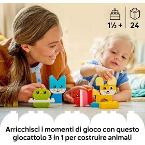 Utilizzando i 24 mattoncini facili da manipolare, progettati appositamente per i bambini più piccoli, i piccoli costruttori possono scegliere di costruire cani, gatti, uccelli, conigli, topi e pesci. Alcuni di questi animali giocattolo per i bambini utilizzano mattoncini LEGO DUPLO monocolore. I piccoli costruttori possono imparare a ordinare per colore per creare il loro animale domestico, completando il loro personaggio aggiungendo un simpatico volto di animale.