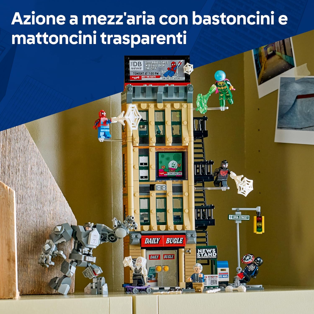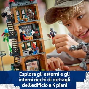 Il giocattolo costruibile del Daily Bugle LEGO | Marvel contiene le minifigure di Spider-Man, Miles Morales, Ghost Spider, J. Jonah Jameson, Mysterio, Venomized Capitan America e Rhino, oltre a 3 bastoncini trasparenti e 2 mattoncini trasparenti per consentire l’azione volante. C’è anche il mech di Rhino snodabile con cabina di guida apribile. Gli interni dettagliati comprendono uffici, reception, sala stampa, una cassaforte e una leva funzionante per cambiare i cartelloni pubblicitari. All’esterno si trovano una scala antincendio, un’edicola mobile e un angolo di strada con semafori. Scarica l’app LEGO® Builder per un’esperienza di costruzione collaborativa con amici e familiari. Il set di costruzione contiene 781 pezzi.