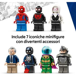 7 MINIFIGURE: include Spider-Man, Miles Morales, Ghost Spider, J. Jonah Jameson, Mysterio, Venomized Capitan America e Rhino, oltre a un mech e 3 bastoncini trasparenti per ricreare l’azione in volo