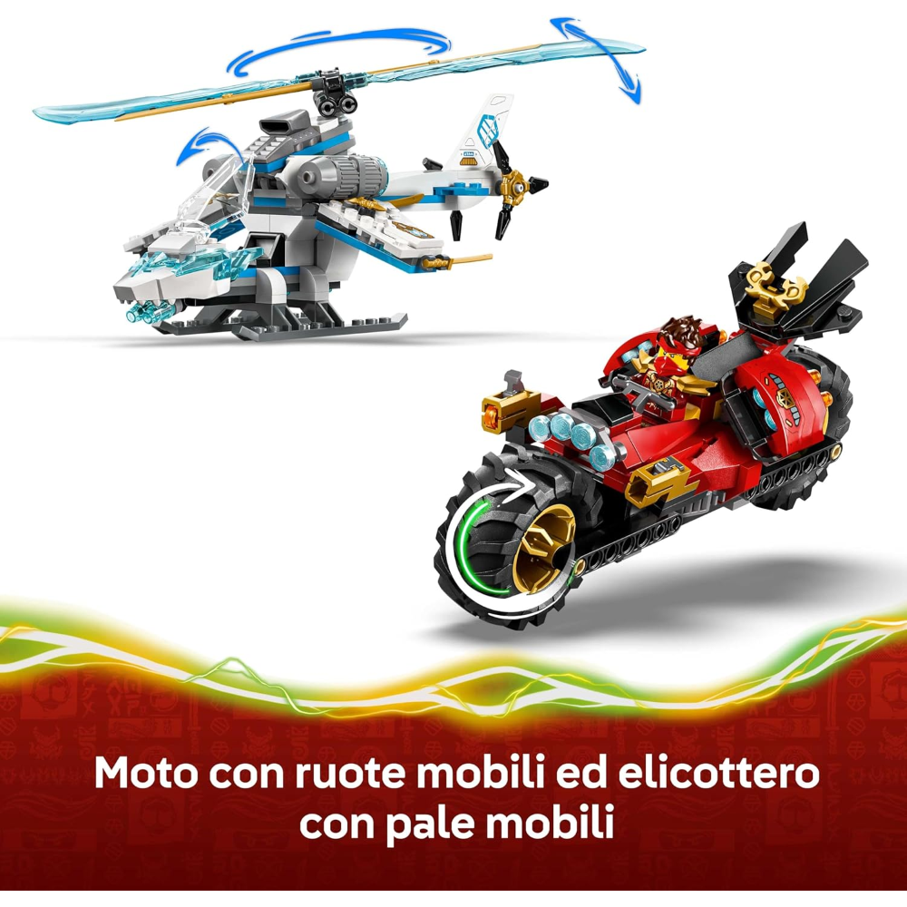 2 VEICOLI NINJA: la moto giocattolo ninja è dotata di ruote mobili, sella-cockpit per una minifigure e 2 shooter, mentre l’elicottero giocattolo è dotato di cabina di pilotaggio apribile e pale rotanti