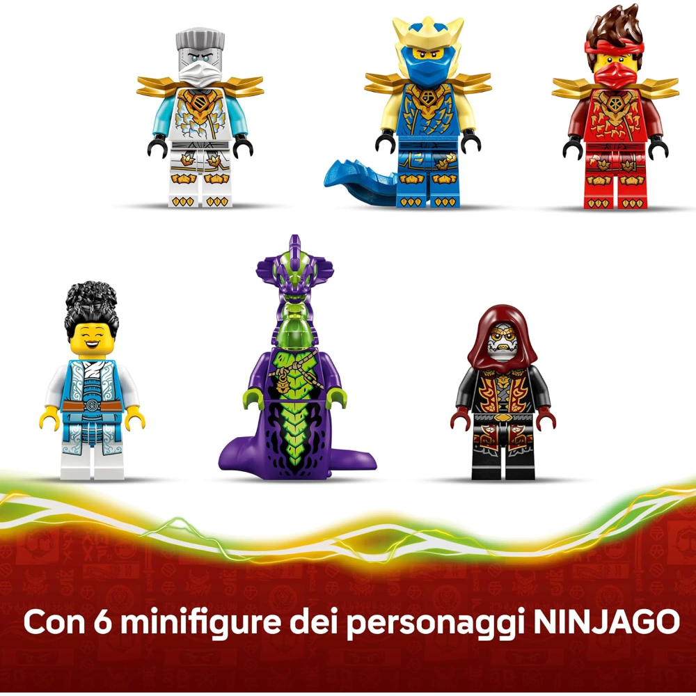 Il set NINJAGO contiene 6 minifigure: Kai, Zane, Jay Forma Drago ed Euphrasia per inscenare battaglie contro il Mostro Acido e il Lealista. I bambini possono costruire il playset con confidenza utilizzando l’app LEGO® Builder: ingrandisci, ruota in 3D e tieni traccia dei progressi con istruzioni digitali facili da seguire. Il set contiene 642 pezzi.