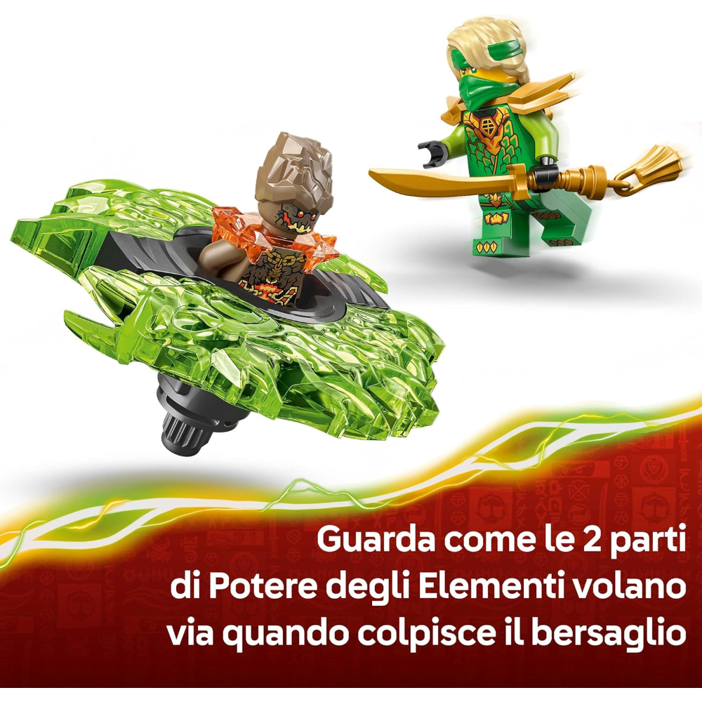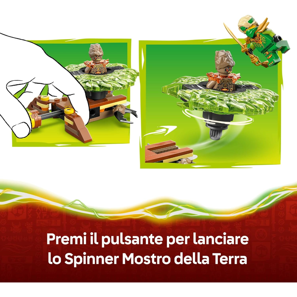 2 MINIFIGURE NINJAGO®: questo giocattolo d’avventura contiene Lloyd e un malvagio Mostro della Terra, che possono inserire all’interno dello spinner, in modo che i bambini possano ricreare battaglie tra il bene e il male ricche di azione