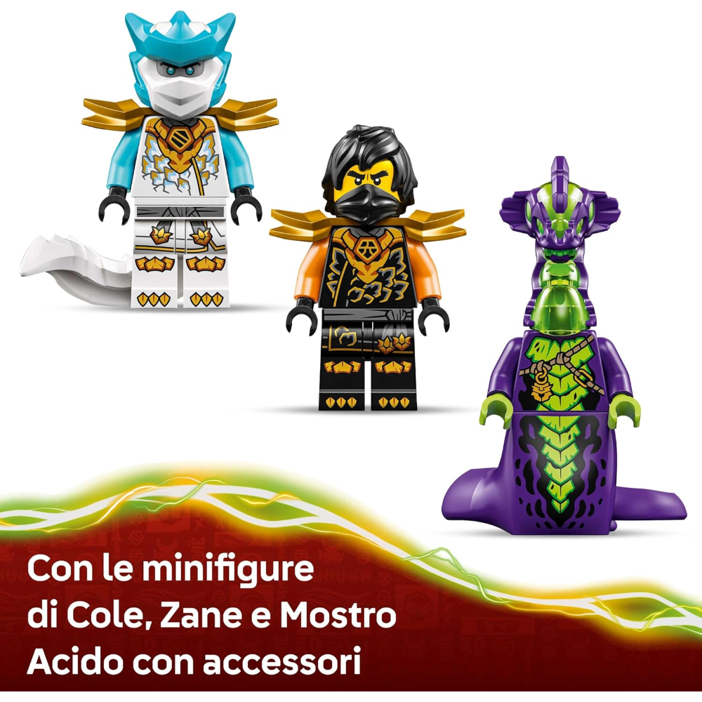 3 MINIFIGURE NINJAGO®: questo set con mech LEGO® include Cole con un martello, drago Zane con una spada e un Mostro Acido con un bastone per consentire ai fan di ricreare battaglie tra il bene e il male