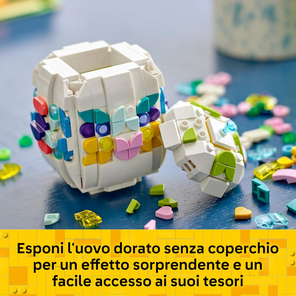 Decorazione primaverile LEGO®: il set include un uovo di Pasqua costruibile con parte superiore rimovibile, pietre preziose speciali cuori dorati, oltre a spazio all’interno per contenere pezzi extra