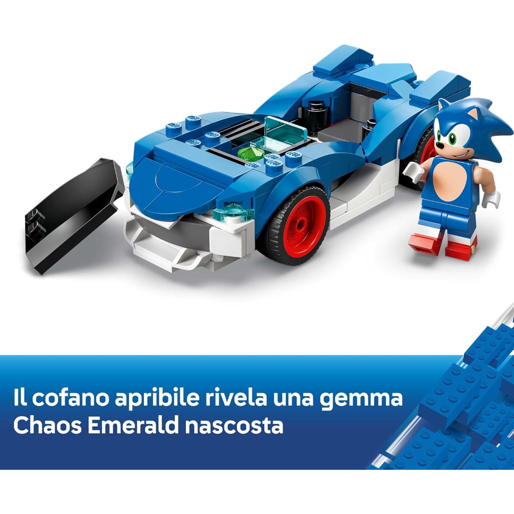 Il veicolo giocattolo interattivo blu e bianco di questo set di gioco LEGO è dotato di grandi pneumatici con bordo rosso e un cofano apribile che rivela una gemma Chaos Emerald nascosta.