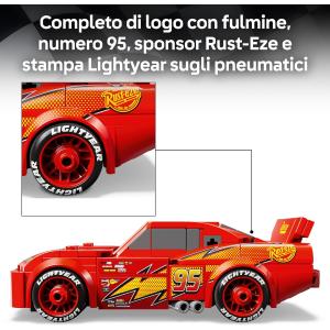 Il modello Disney è dotato del famoso fulmine giallo e arancione di Saetta McQueen, il numero 95, il logo dello sponsor Rust-Eze, gli pneumatici con stampa "Lightyear" e i suoi famosi adesivi dei fari. L’auto giocattolo è anche l’unico modello Speed Champions con un telaio dettagliato che arricchisce ancora di più il divertimento dei bambini.