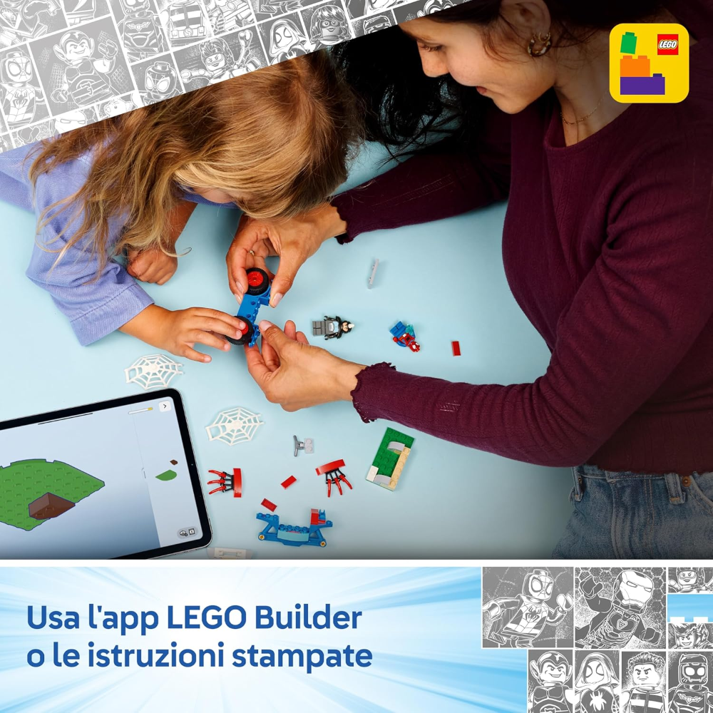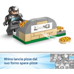 I bambini aiutano Spidey a recuperare una gemma blu rubata, a schivare pizze volanti lanciate dal forno spara-pizze di Rhino e a catturare Rhino in una gigantesca trappola a forma di ragnatela, che può essere posizionata anche sulla motocicletta. Progettato per i giovani costruttori, questo set costruibile è ricco di dettagli per ispirare i bambini con un gioco di fantasia senza fine. È un fantastico regalo di compleanno o per qualsiasi occasione per i fan di Spidey e dei suoi fantastici amici. Contiene istruzioni illustrate colorate, grandi Starter Brick e buste separate con 1 modello costruibile per busta per rendere la costruzione veloce e divertente. E con l’app LEGO® Builder, i bambini possono costruire con sicurezza: ingrandisci, ruota in 3D e tieni traccia dei progressi con istruzioni digitali facili da seguire. Il set contiene 61 pezzi.