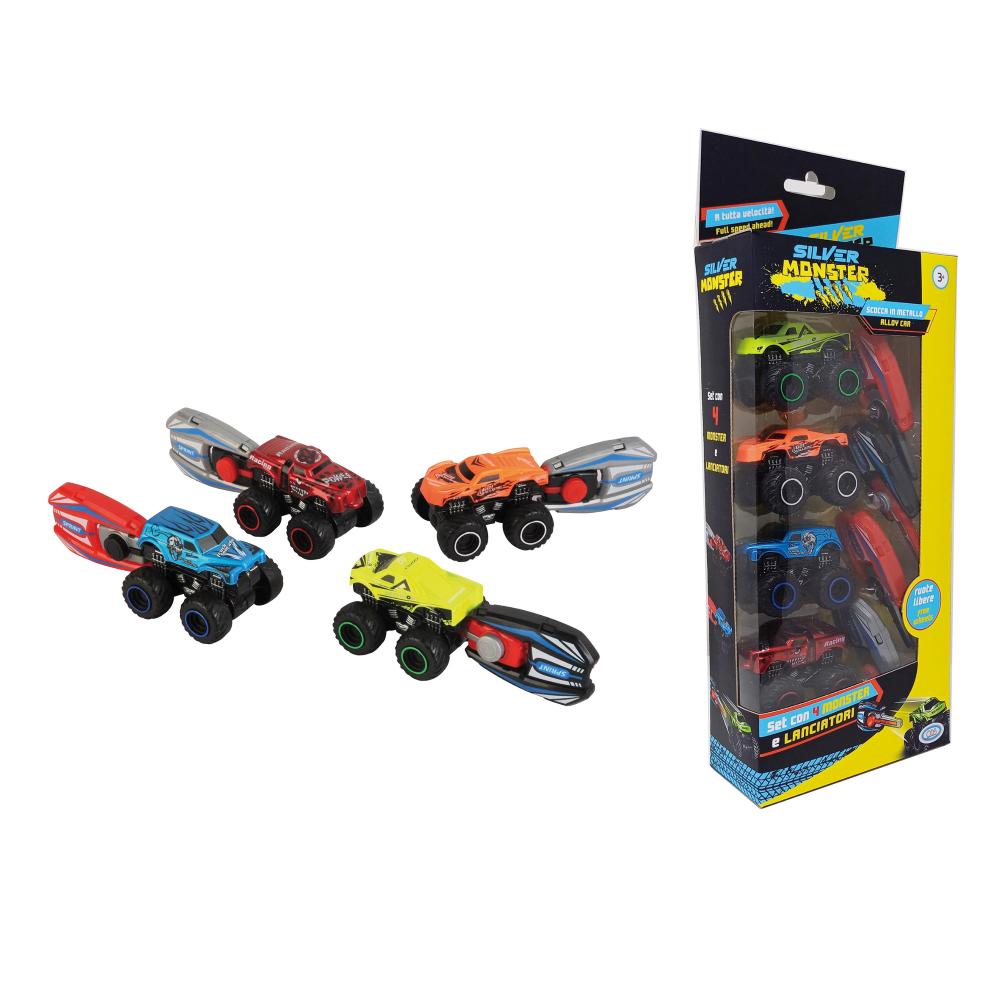 Silver Monster - Multipack con 4 Auto e lanciatore monster a ruote libere con lanciatore, SCOCCA IN METALLO