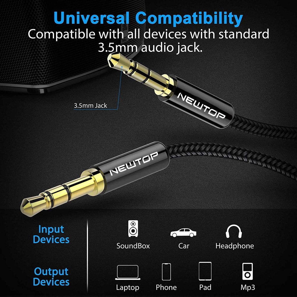 Per utilizzare un dispositivo elettronico con qualsiasi altro dispositivo dotato di un'uscita audio o delle cuffie, sarà necessario usare il nostro cavo Aux 3.5mm Audio. Il cavo NewTop AUX03 è dotato di 3 connettori e una lunghezza pari a 200 cm, cosicchè potrai utilizzare il tuo dispositivo oppure poggiarlo dove vuoi, senza che resti vicino al dispositivo dotato di un'uscita audio.