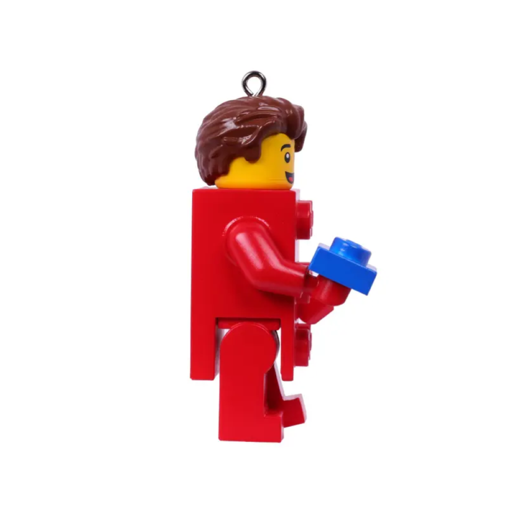 DECORAZIONE NATALIZIA LEGO® – L'ornamento LEGO Brick Suit Guy Keepsake ha un corpo a forma di mattoncino LEGO rosso 2x3 e un regalo a forma di mattoncino blu in una mano