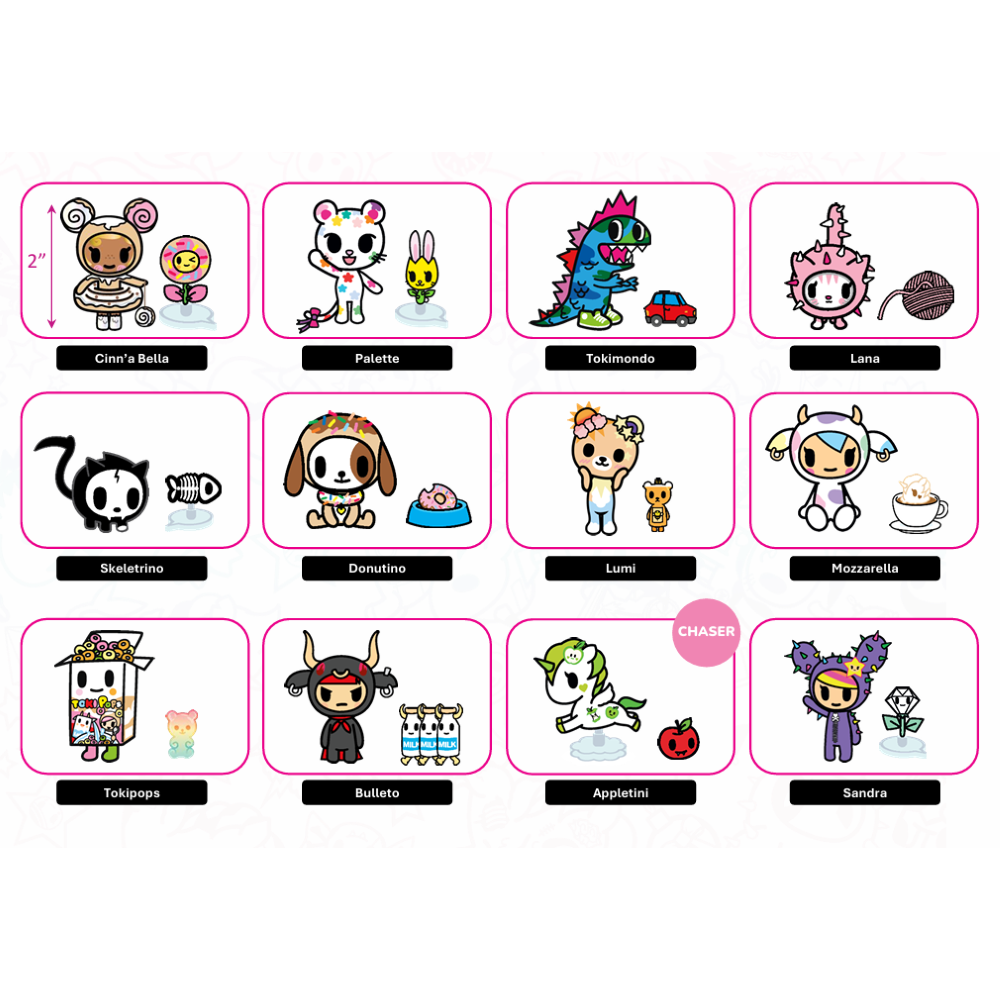 Caratteristiche delle figure: Le figure sono piccole statuette in stile Tokidoki, un marchio creato dall'artista italiano Simone Legno, noto per il suo design ispirato alla cultura giapponese e alla street art. Ogni personaggio è unico e viene fornito con un piccolo accessorio.
