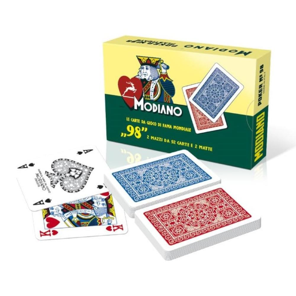 Carte da gioco Modiano Ramino 98, le più diffuse in Italia con il re Modiano disegnato da Sigon negli anni '50. Cofanetto con 2 mazzi da 54 Carte (52 + 2 jolly). Materiale: Cartoncino Triplex Plastificato. Misura: 88 x 63 mm (Poker Size). Colore Dorso: Blu/Rosso.