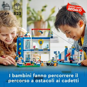 Divertenti caratteristiche e funzioni: i bambini possono mettere alla prova le minifigure dei cadetti della polizia con una parete da arrampicata giocattolo, una scala orizzontale e una teleferica, oltre a un divertente percorso a ostacoli mobili.