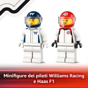 Cosa è compreso nella confezione? Il set contiene 2 modelli di auto da corsa F1, con 2 minifigure dei piloti della Williams Racing e della Haas, dotati di caschi e di tuta sportiva