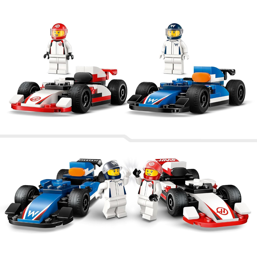 Cosa è compreso nella confezione? Il set contiene 2 modelli di auto da corsa F1, con 2 minifigure dei piloti della Williams Racing e della Haas, dotati di caschi e di tuta sportiva