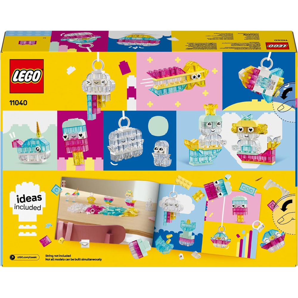 Set di costruzioni LEGO creative: i mattoncini trasparenti, gli occhi e le bocche, oltre ai mattoncini-gancio per l’esposizione o da usare come portachiavi, aggiungono brillantezza trasparente e tanto divertimento alle creazioni dei piccoli fan