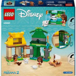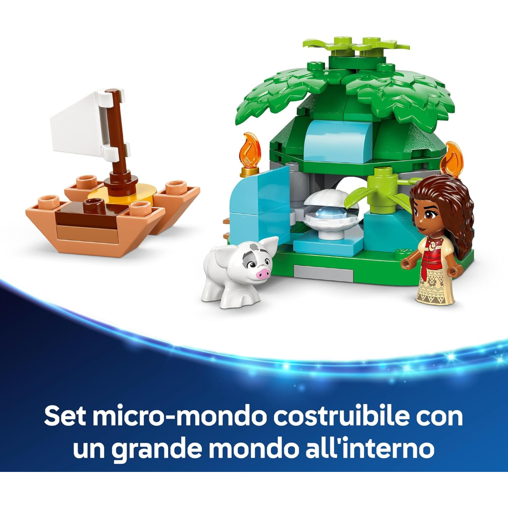 Modellino Disney da costruire: il set contiene un modello di isola/casa giocattolo a doppia faccia con una chiave, una barca LEGO, le micro bamboline di Vaiana LEGO | Disney e della sorellina Simea, oltre all'animale Pua