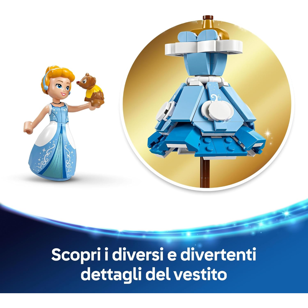 Per gli amanti delle Principesse Disney: il set comprende un abito costruibile, un supporto per il vestito e un espositore con 2 stanze segrete e spazio per la mini bambolina di Cenerentola LEGO | Disney e il personaggio animale Gus LEGO | Disney