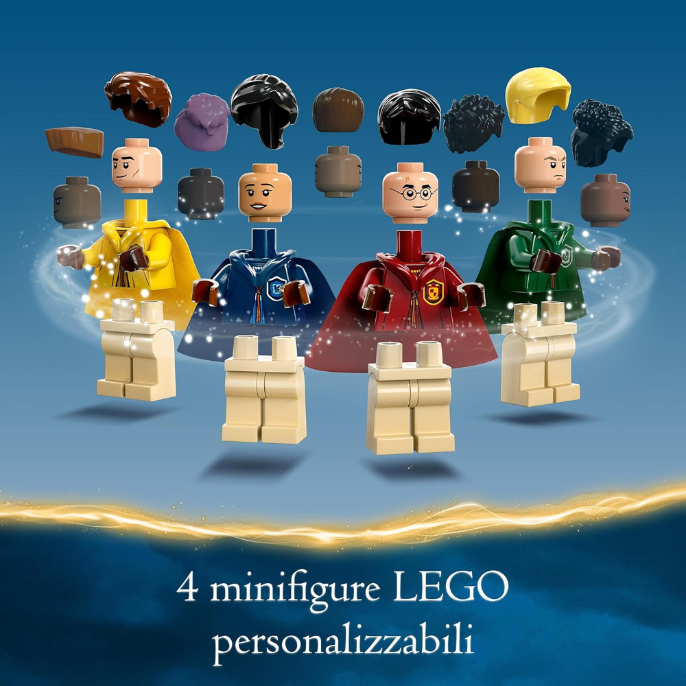 4 minifigure LEGO® personalizzabili: Harry Potter™, Draco Malfoy™, Cedric Diggory e Cho Chang, più 10 teste aggiuntive (6 diverse tonalità di pelle) e 10 capigliature extra per creare giocatori unici