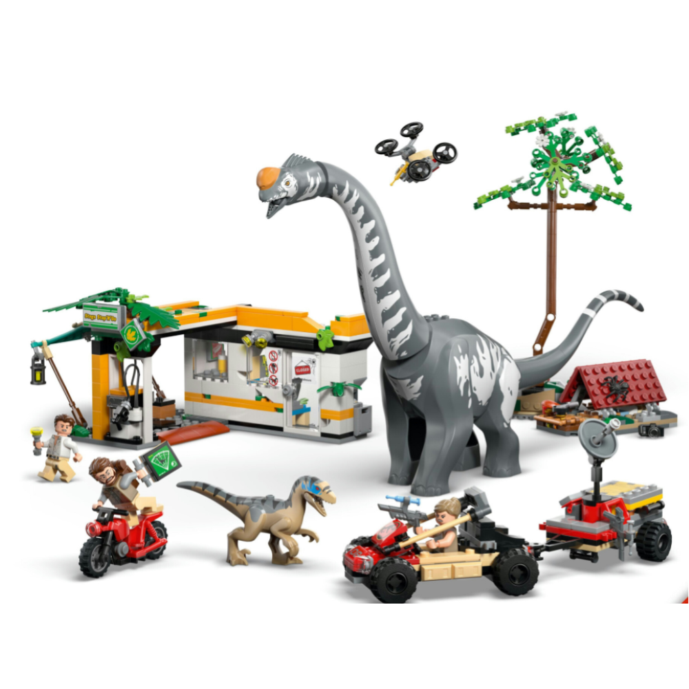 Funzioni creative: il set include un albero che cade, un drone attaccabile al veicolo giocattolo o al tetto della stazione, un Velociraptor con mascella apribile e un Titanosauro con testa, collo e coda mobili