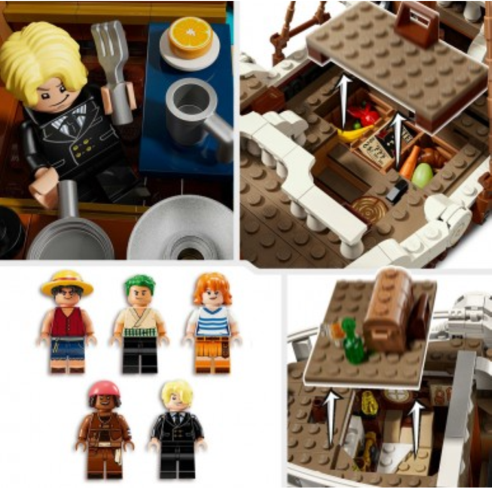 L’iconica nave è dotata di diversi spazi interni: una cabina per l’equipaggio, una cucina, un magazzino e un’officina per gli accessori. Il modello contiene 5 minifigure LEGO ONE PIECE. Luffy siede sulla polena della pecora nella parte anteriore della nave, sotto la quale si trova un cannone; Zoro si rilassa e si allena sul ponte; Nami controlla il timone nella parte posteriore, dove sul ponte crescono i suoi alberi di mandarino preferiti; Usopp si arrampica sugli alberi e fa la guardia dalla coffa; Sanji porta le pentole giù per le scale fino alla cucina. Include 4 poster "Ricercato". L’app LEGO Builder permette ai bambini di ingrandire, ruotare i modelli in 3D e seguire i progressi. Il set contiene 1.376 pezzi.