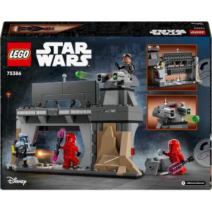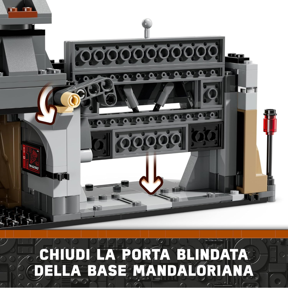 Giocattolo Star Wars™ costruibile per bambini: la base mandaloriana di questo set è dotata di una porta pesantemente corazzata con meccanismo a chiusura rapida e pannelli di controllo, oltre a una torretta rotante spara-bottoncini