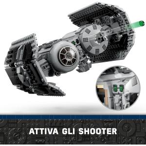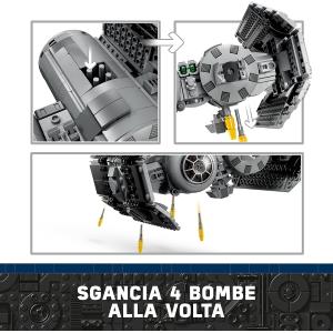 Il TIE Bomber, realizzato con le costruzioni LEGO, ha una cabina di pilotaggio apribile e spazio per una minifigure, vano testata con funzione di lancio, spazio per 4 bombe (6 bombe sono incluse) e 2 shooter