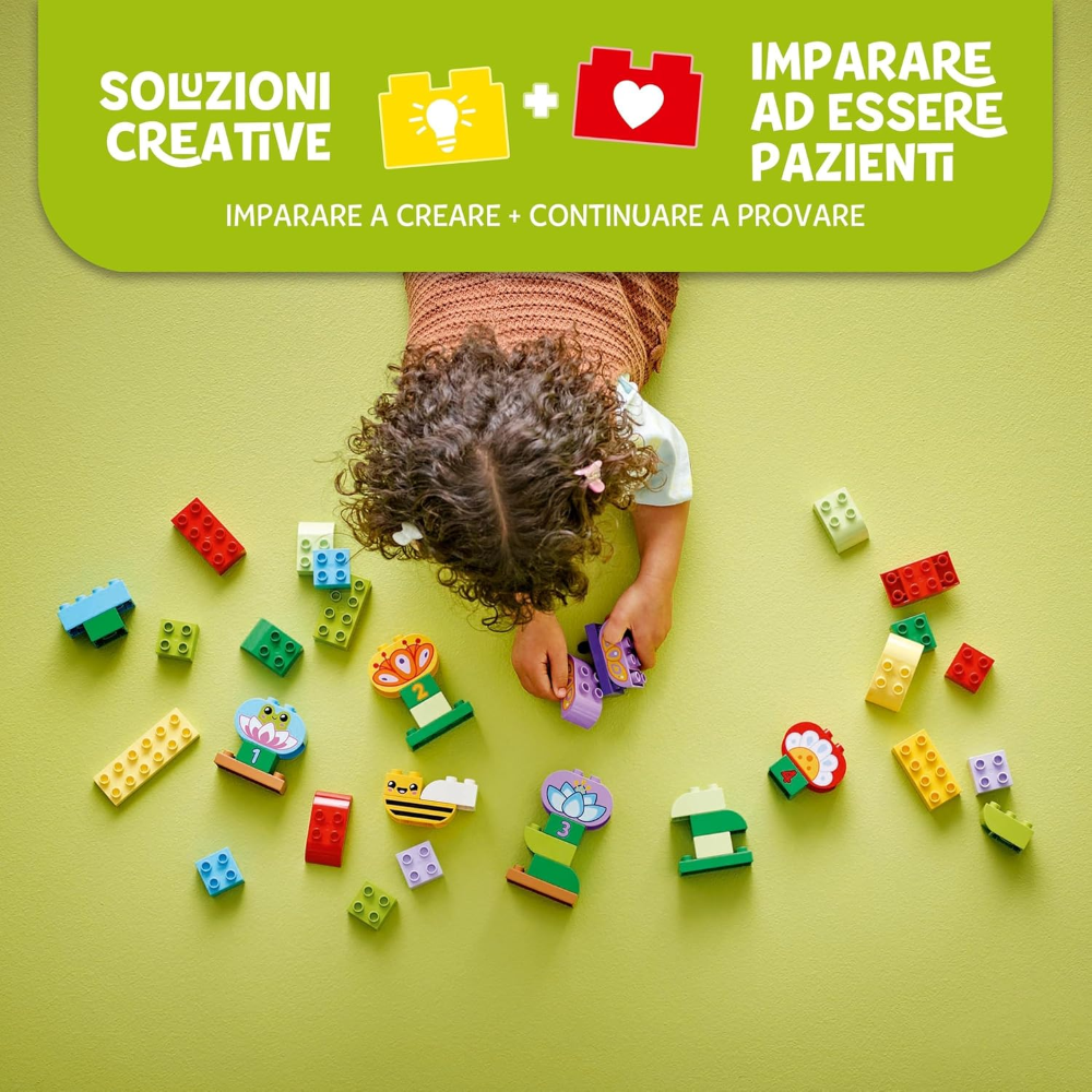 Giochi impilabili con i numeri: il set include un assortimento di mattoncini che raffigurano numeri, fiori e animali LEGO DUPLO, che consentono ai piccoli di ricreare e interagire con il mondo che vedono intorno a loro