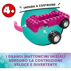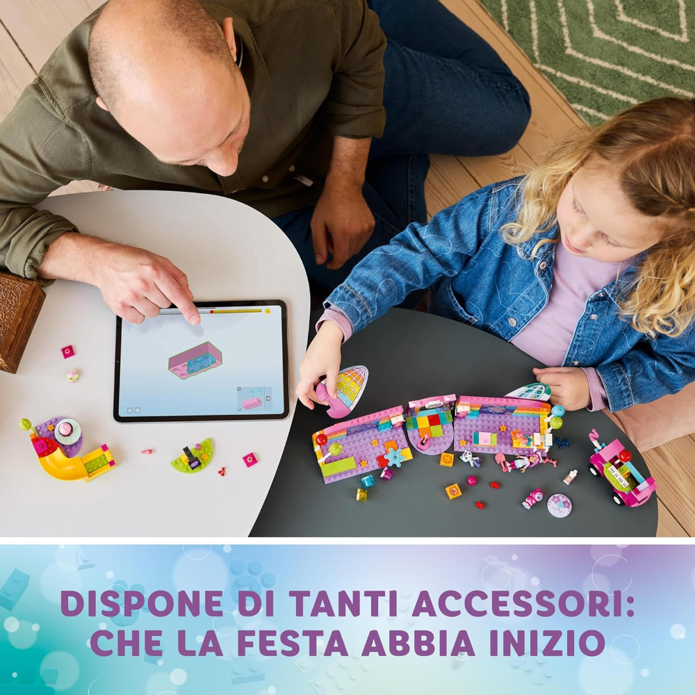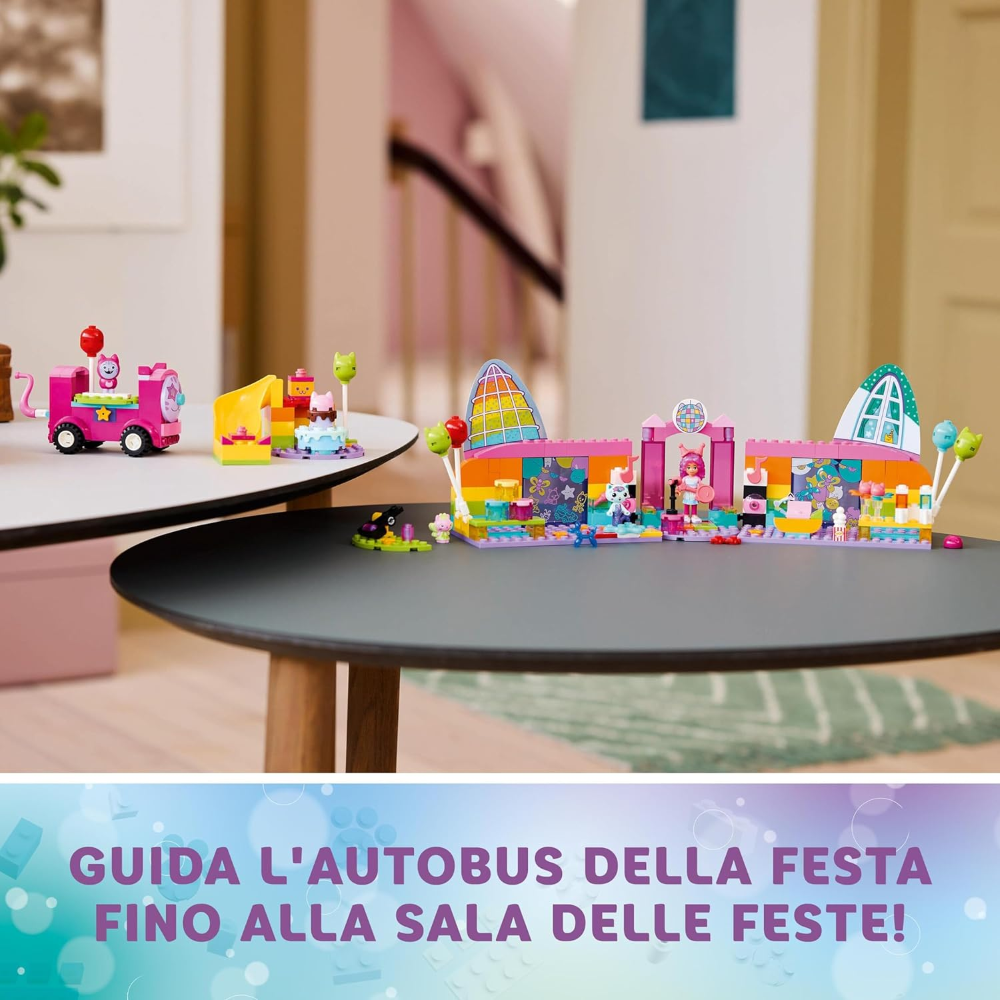 Questo giocattolo per i bambini e le bambine è un entusiasmante playset con discoteca e molto altro ancora! Con i personaggi di Gabby, Daniel James "DJ" Catnip, Gattina Fatina e Siregatta e una varietà di giocattoli musicali per le feste, tra cui un party bus a spinta con tastiera incorporata, una pista da ballo girevole, chitarra, 2 microfoni e una scintillante palla da discoteca, il palcoscenico è pronto per un gioco di fantasia senza fine! Gli accessori includono palloncini e pattini a rotelle per la discoteca, popcorn e 2 bicchieri pieni di granita per la zona relax, lattine e una catapulta per giocare ad abbatterle. Ci sono una torta per Gabby e pacchetti con regali all’interno che vengono consegnati lungo lo scivolo del set da gioco. Il set contiene un grande Starter Brick per aiutare i bambini a iniziare a costruire. Una colorata guida illustrata fornisce istruzioni intuitive.