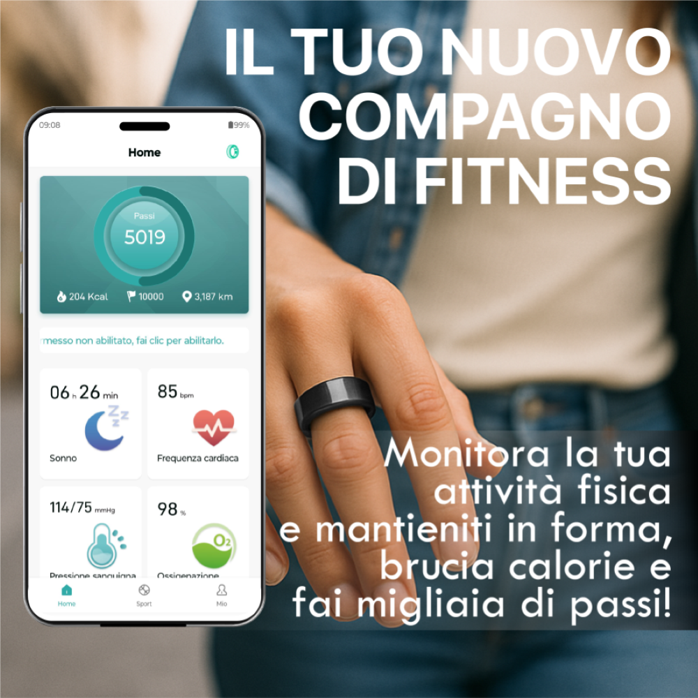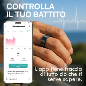 L’anello presenta un design essenziale, realizzato con materiali resistenti e impermeabili (certificazione IP68), adatto all’uso quotidiano e in ambienti umidi.