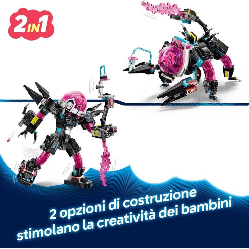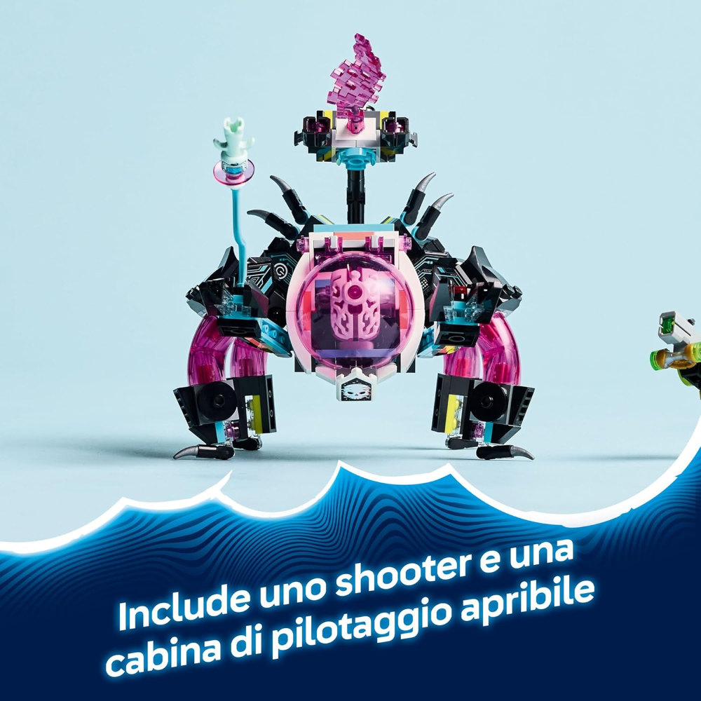Creatura ricostruibile in mattoncini: i giovani sognatori possono iniziare costruendo una capsula colorata, per poi ricostruirla in un robot giocattolo Mech Cyber Ragno LEGO DREAMZzz o in un Mech Cyber cerebro-scorpio
