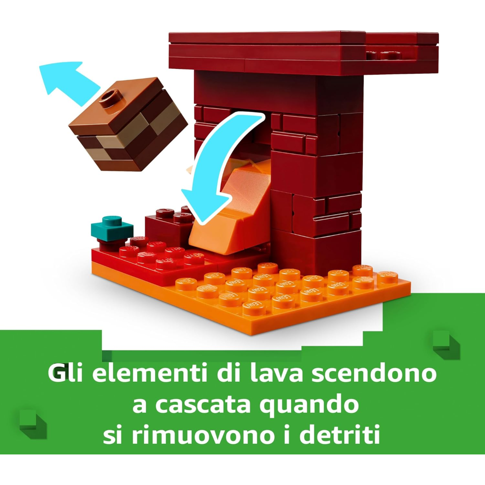 Azione nella fortezza del Nether LEGO Minecraft: i giocatori dovranno usare tutta la loro bravura per raccogliere antichi detriti, sfuggire a una valanga di lava, combattere mob e cavalcare una figura Minecraft per mettersi in salvo