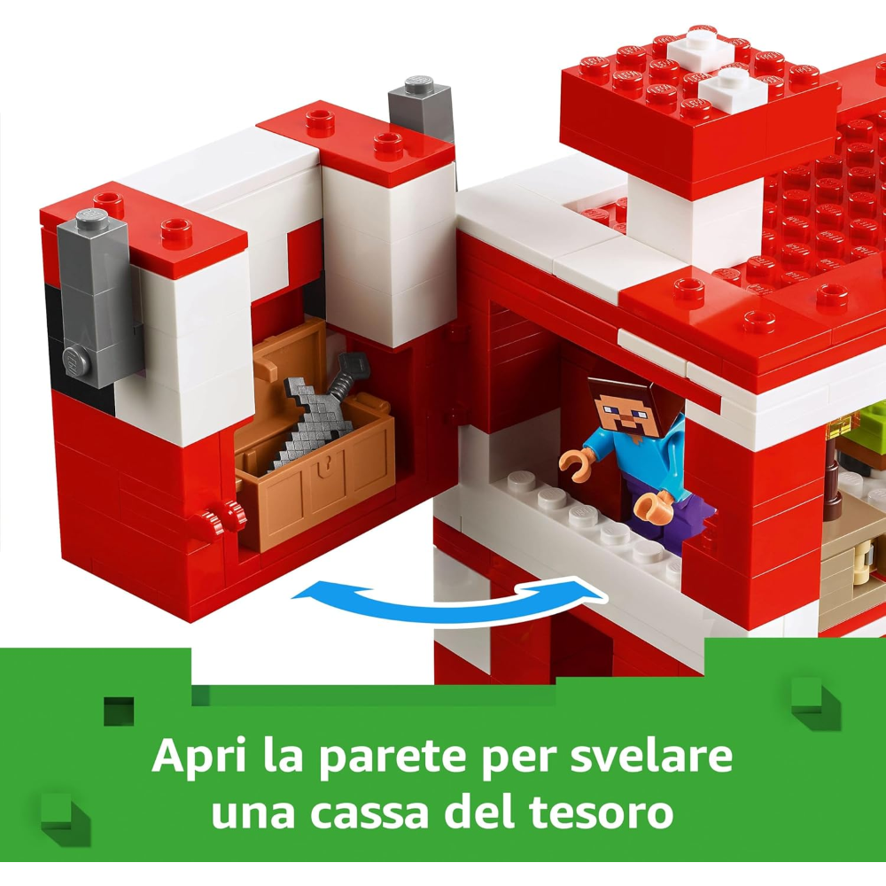 Gioco da costruire per bambini tratto dal videogioco: i piccoli costruiscono una grande casa LEGO a forma di fungo con una piccola fattoria su un’isola, vanno a pescare in barca e cercano il tesoro