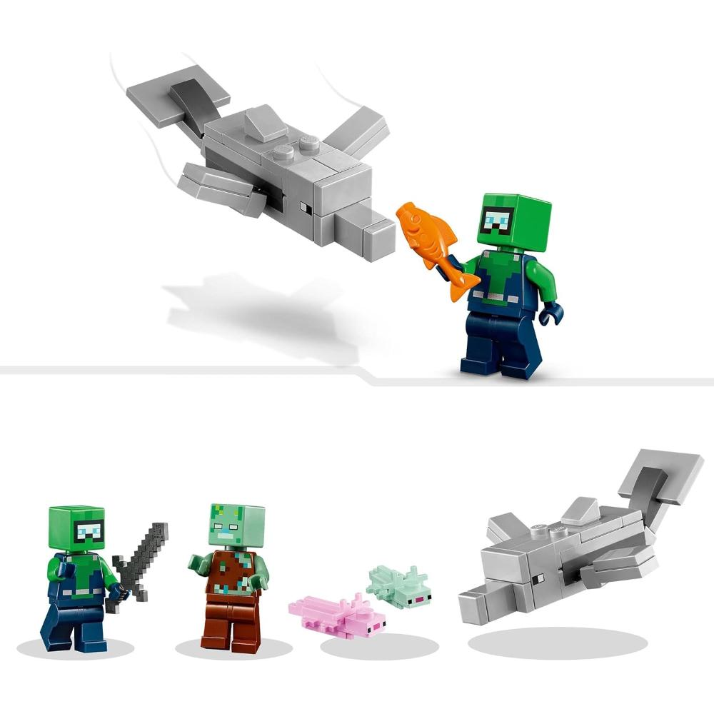 Personaggi familiari: include personaggi Minecraft® autentici, tra cui un esploratore sottomarino, uno zombie annegato, un delfino, un pesce palla, 2 axolotl adulti e un axolotl in un secchio