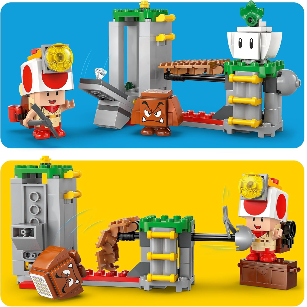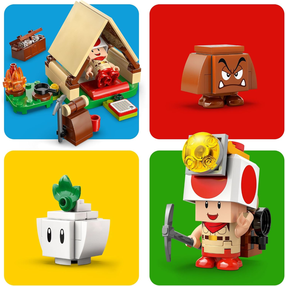 3 personaggi LEGO Super Mario: questo giocattolo LEGO Super Mario ispirato ai videogiochi comprende Capitan Toad, una rapa e un Goomba, oltre a uno zaino, un piccone, una padella e un diamante