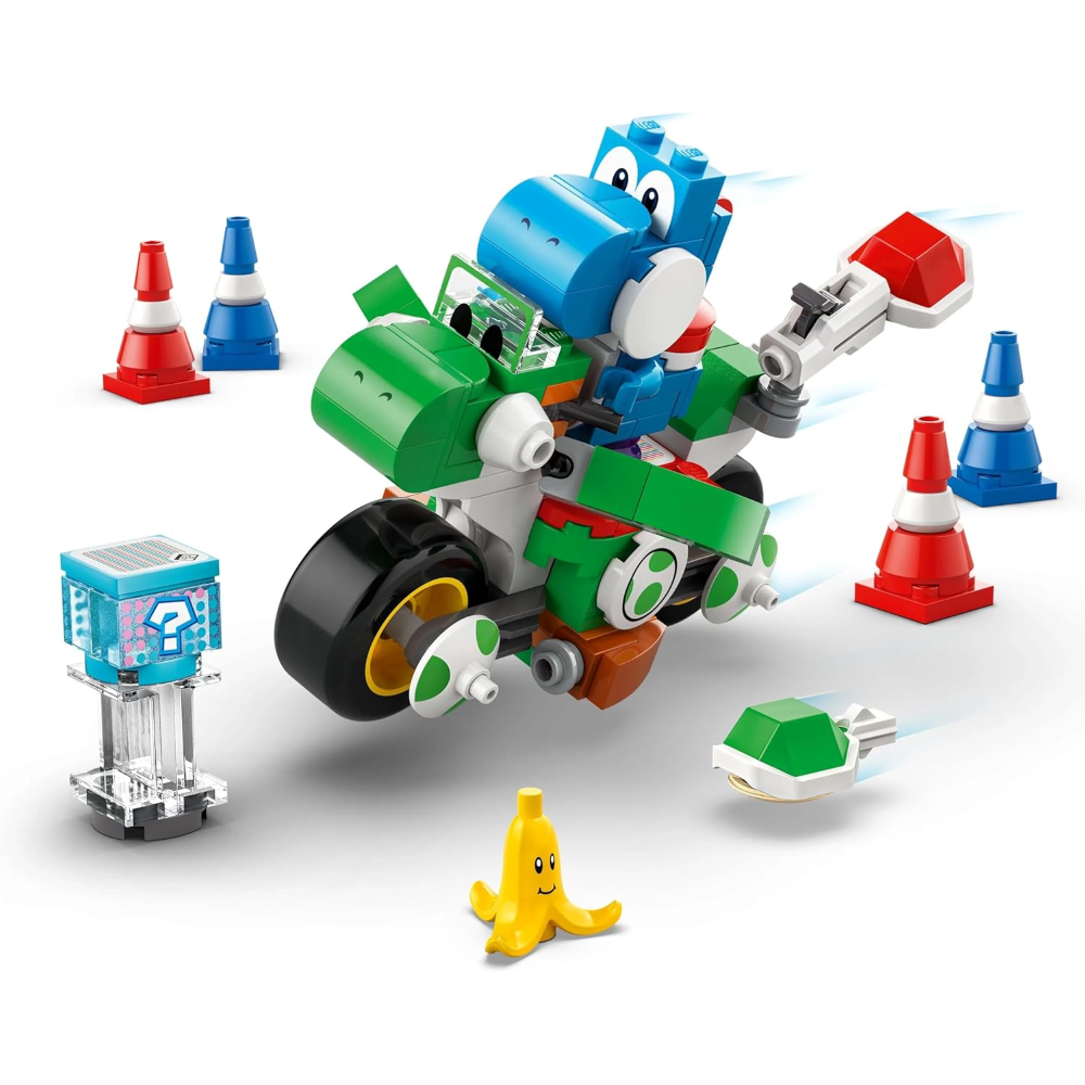Include il personaggio Mario Kart di Yoshi di colore azzurro: per la prima volta in un set LEGO Super Mario , è disponibile il personaggio di Yoshi azzurro, insieme ad un elemento banana con viso decorato