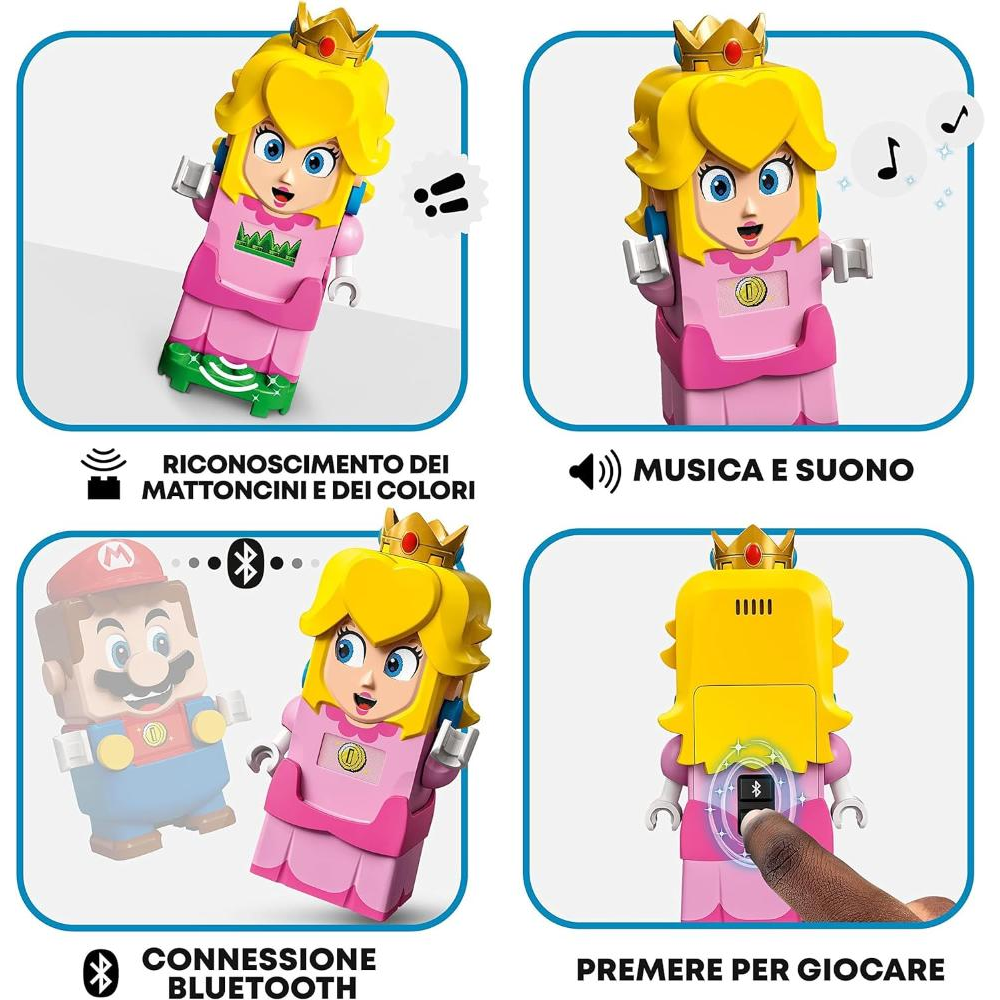 Personaggio di LEGO® Peach™ interattivo: dispone di un sensore di colore, uno schermo LCD per visualizzare le diverse reazioni istantanee al movimento e un altoparlante che riproduce i classici suoni e le musiche del videogame