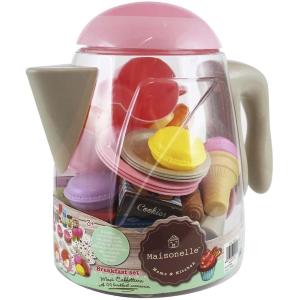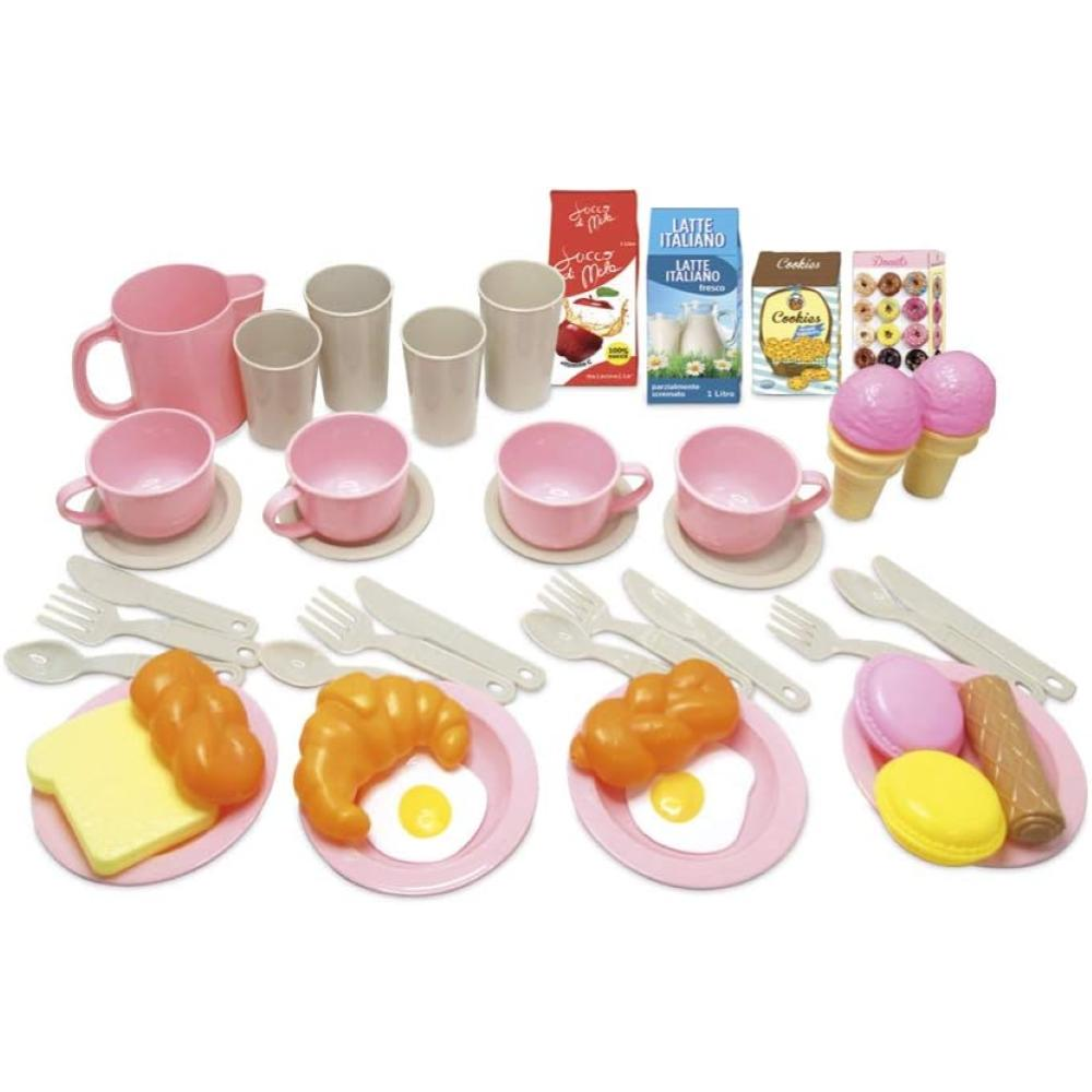 Maxi caffettiera con 44 Accessori Colazione: Servizio di tazzine, Bicchieri, piattini, forchette, cucchiai e coltelli per 4 Persone, scatoline, Uova e brioches, Colore Rosa