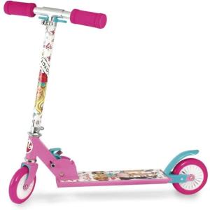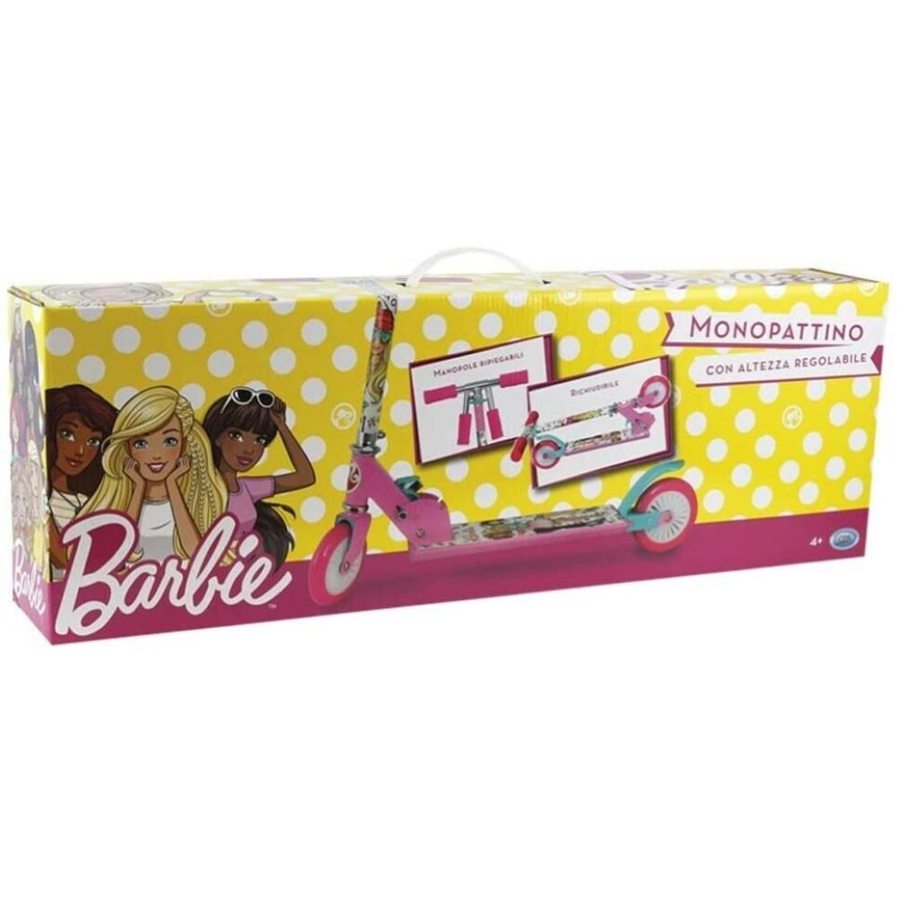 Monopattino, brandizzato Barbie, a due ruote regolabile in altezza fino a 70cm. Dotato di freno su ruota posteriore e di una base di appoggio di 65cm. Struttura e manopole ripiegabili.