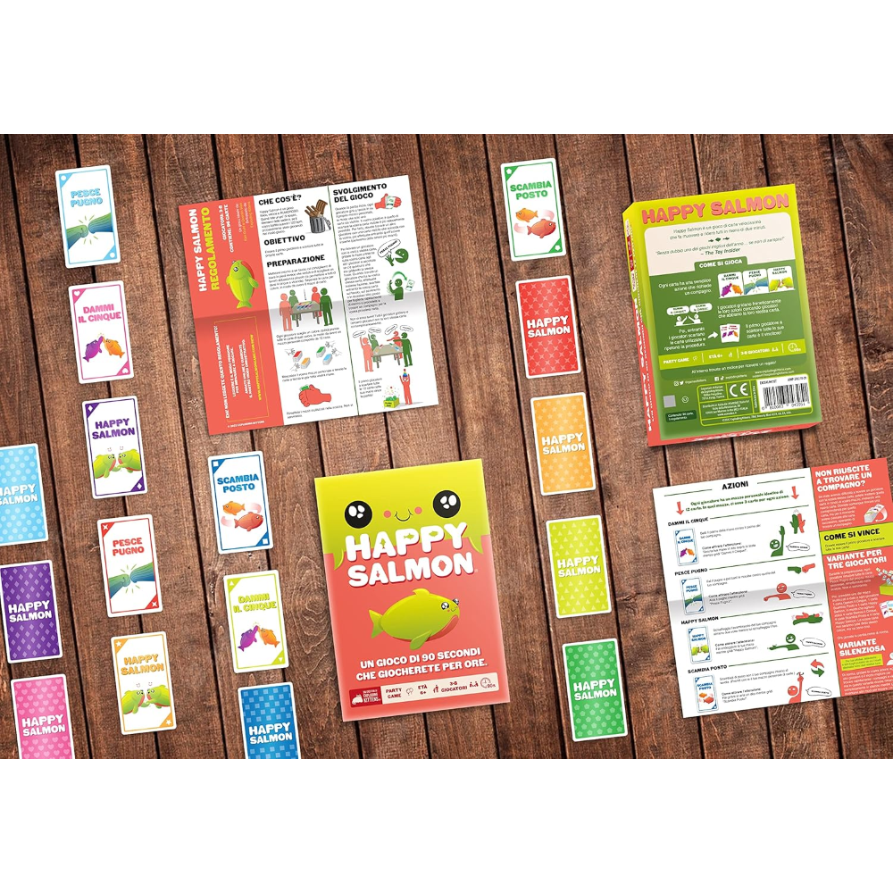 Happy Salmon è un gioco di carte velocissimo che fa muovere e ridere tutti in meno di due minuti. Ogni carta ha una semplice azione che richiede un compagno. I giocatori gridano freneticamente le loro azioni cercando giocatori che abbiano la loro stessa carta. Poi, entrambi i giocatori scartano le carte utilizzate e ripetono la procedura. Il primo giocatore a scartare tutte le sue carte è il vincitore!